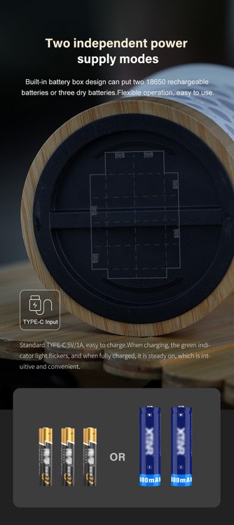 📏 طراحی محصول کوچکتر و سبک است (ابعاد 116×195 میلیمتر، وزن ≈550 گرم) و به خاطر ترکیب زیبا و طبیعی چوب بامبو میتواند بهعنوان چراغ دکوراتیو داخل یا خارج از خانه هم استفاده شود.