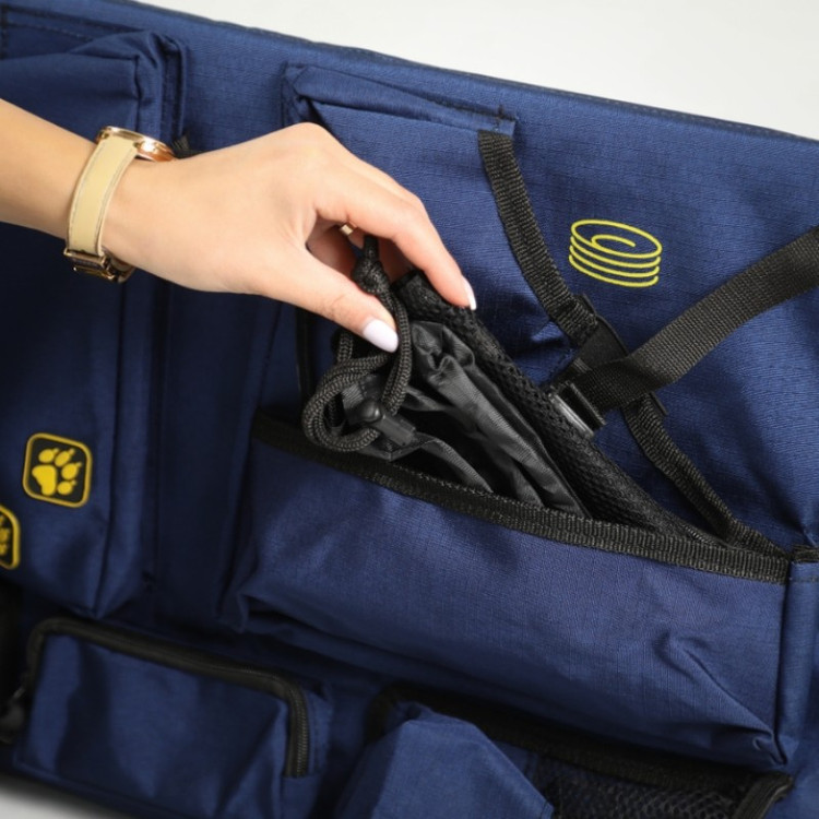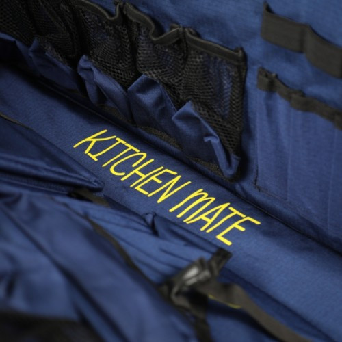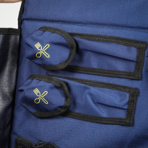 این کیف با طراحی ماژولار و جیبهای متنوع، جای مخصوص برای چاقو، کفگیر، قاشق، تابه، ادویه، اجاق کوچک و دیگر لوازم آشپزی دارد.